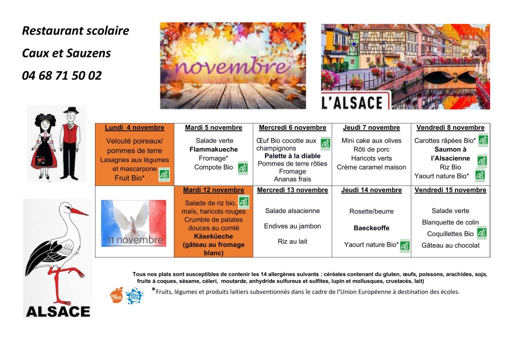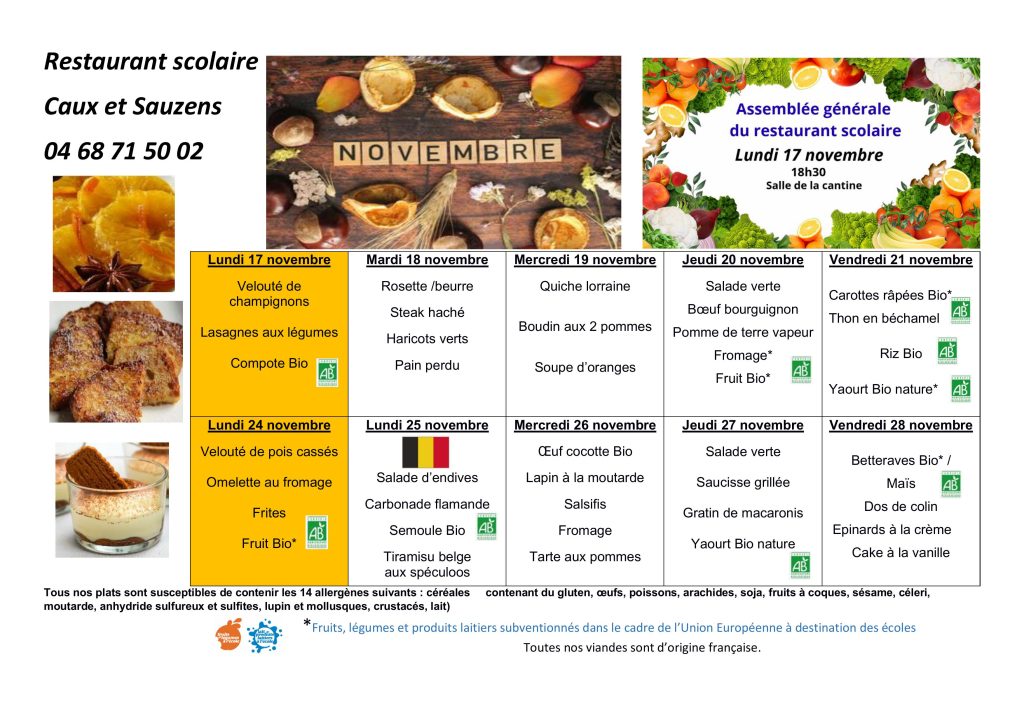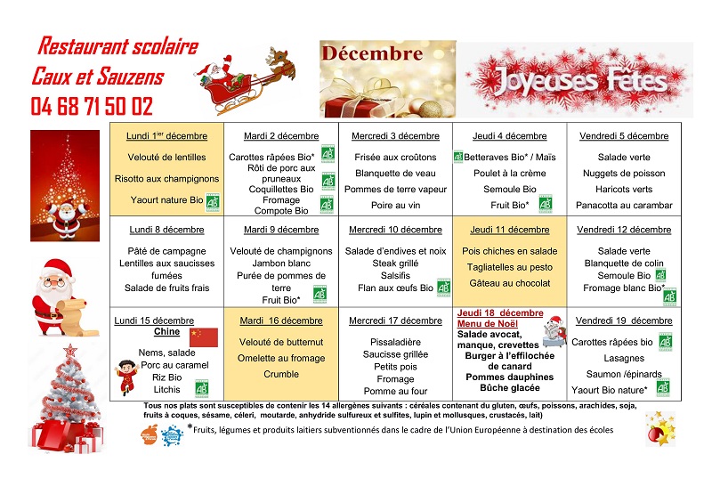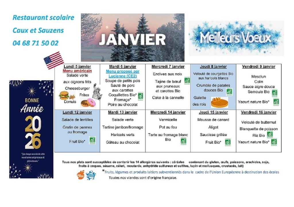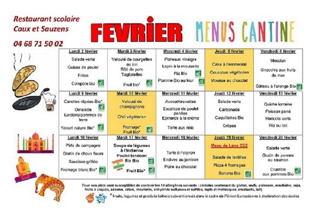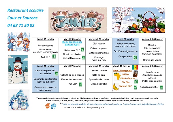 Les menus sont prévus pour 2 semaines, affichés en Mairie et sur le tableau d’information de l’école.